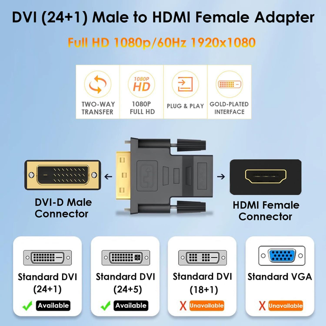Adaptateur DVI vers HDMI, DVI-D mâle vers HDMI femelle